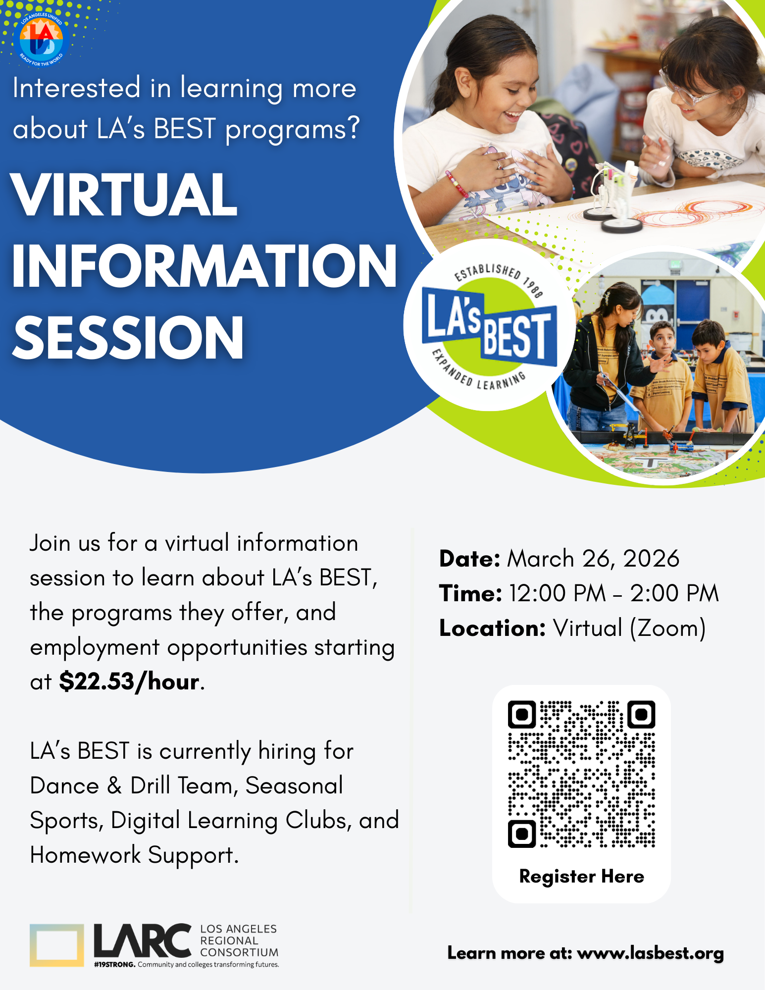 Join us for a virtual information session to learn about LA’s BEST, the programs they offer, and employment opportunities starting at $22.53/hour. LA’s BEST is currently hiring for Dance & Drill Team, Seasonal Sports, Digital Learning Clubs and Homework Support.