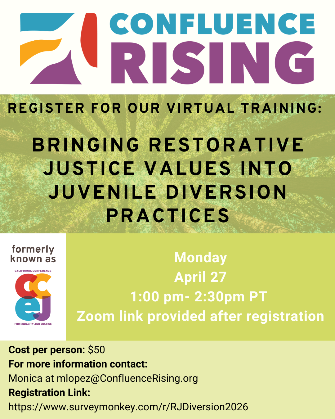 Virtual Bringing Restorative Justice Values into Juvenile Diversion Practices Training Apr 27 Virtual Bringing Restorative Justice Values into Juvenile Diversion Practices Training 1:00 pm - 2:30 pm $50